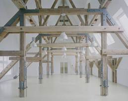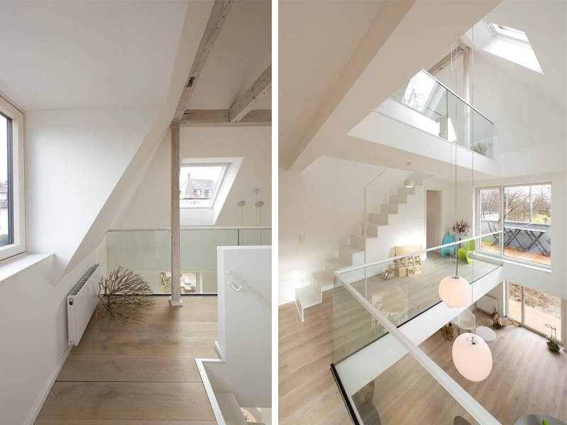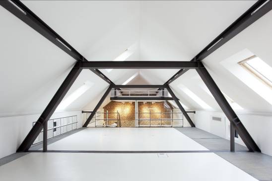 Ein Stallgebäude einer denkmalgeschützten Hofanlage aus dem Jahre 1895 in Meerbusch wurde von dem Architekturbüro mo.studio in ein Büro mit Ausstellungsfläche umgebaut. Im Rahmen der Sanierungsmaßnahmen wurde das ursprüngliche Erscheinungsbild wiederhergestellt und zugleich die Belichtungssituation im Inneren deutlich verbessert. Dazu wurden die ehemaligen Fassadentore in den bestehenden Rundbögen durch Glastore ersetzt. Die natürliche Belichtung der Arbeitsplätze auf einer Galerie erfolgt über VELUX Dachfenster. Durch ihre Südost-Ausrichtung gewährleisten diese nahezu während der gesamten Arbeitszeit optimales Tageslicht. Gleichzeitig wurden direkt unter dem Giebel weitere elektrisch bedienbare Dachfenster eingebaut, die dem Klima und der Belüftung dienen. Im Inneren wurde das gesamte Holzsprengwerk aus statischen Gründen durch ein Stahlskelett ersetzt, in dem nun die Ebenen nahezu im Raum schweben können. Die Außenhaut bleibt somit unberührt und ablesbar, um dem früheren Charakter weiterhin erfahrbar zu machen.